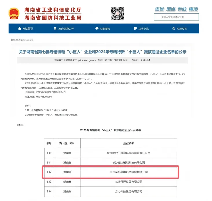 Oktobra 2025 je Ministrstvo za industrijo in informacijsko tehnologijo zaključilo postopek pregleda za podjetja "Mali velikani" za leto 2025 v okviru klasifikacije "Specializirano, prečiščeno, diferencialno in inovativno" in uradno objavilo seznam. Kingmach Measurement & Monitoring Technology Co., Ltd je uspešno prestala strogi pregled in ponovno pridobila to čast na nacionalni ravni, zahvaljujoč svoji vztrajni sposobnosti inovacij, strokovni tehnični moči in stabilni tržni uspešnosti.