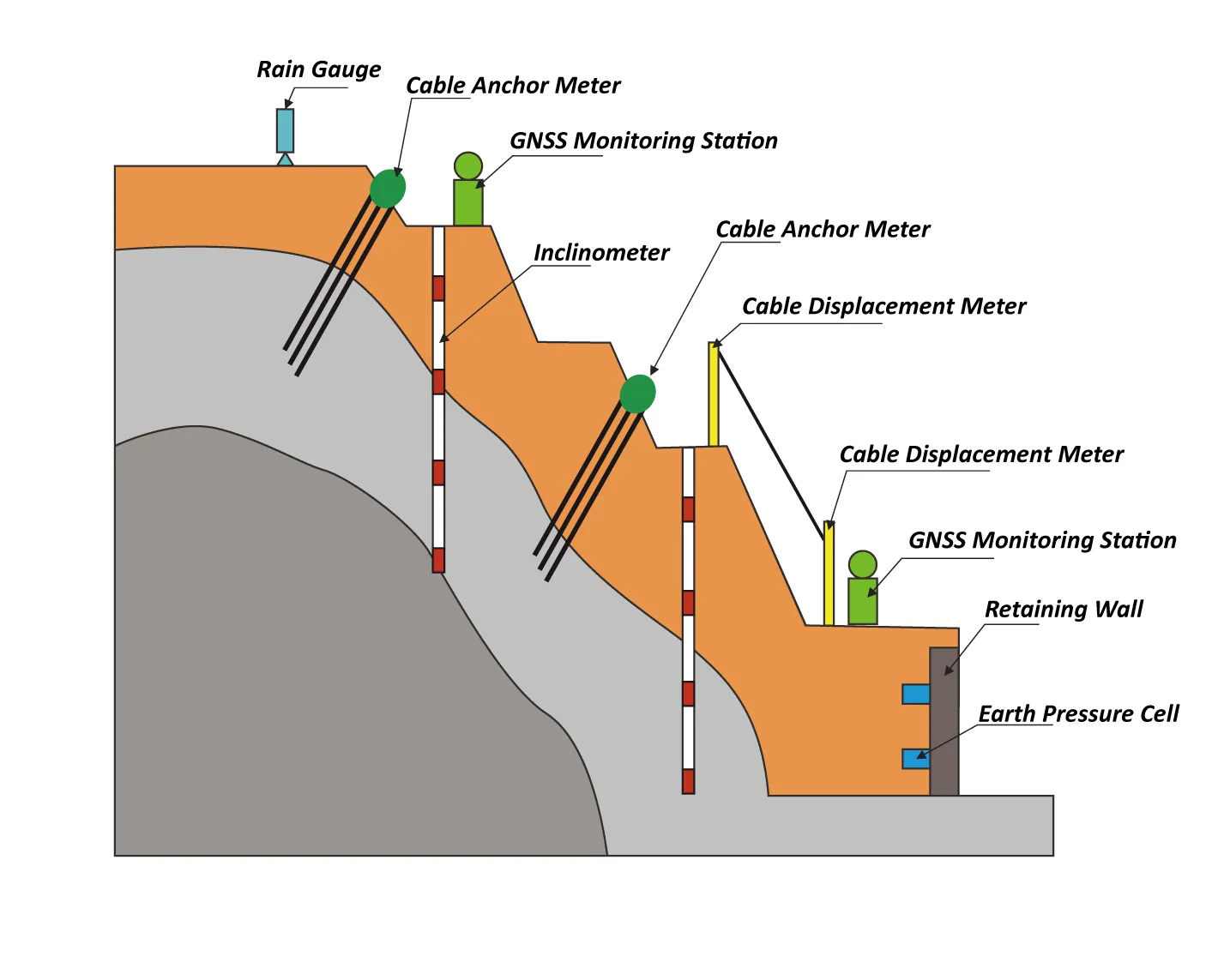 Z uporabo visoko natančnih in zelo zanesljivih nadzornih senzorjev učinkovito nadzoruje stabilnost pobočij. S kombinacijo podatkov spremljanja in makroskopskih deformacij in znakov odpovedi se izvedejo celovite presoje za določitev varnosti naklonskih konstrukcij in spremljanje nosilnosti, obratovalnega stanja in trajnosti nosilnih konstrukcij itd., da se izpolnijo zahteve varnega delovanja.